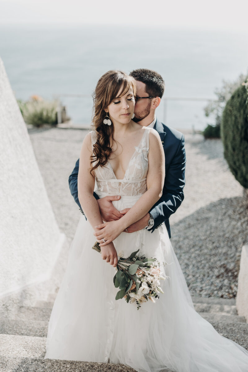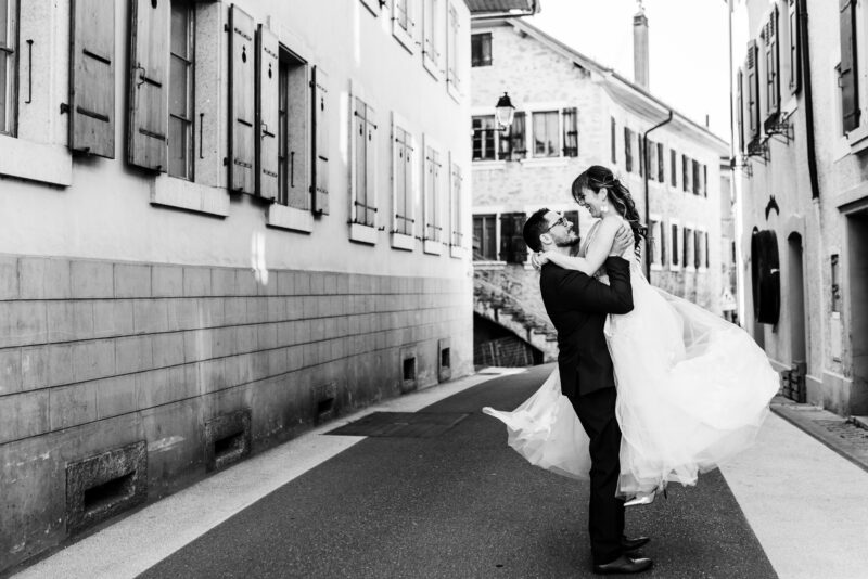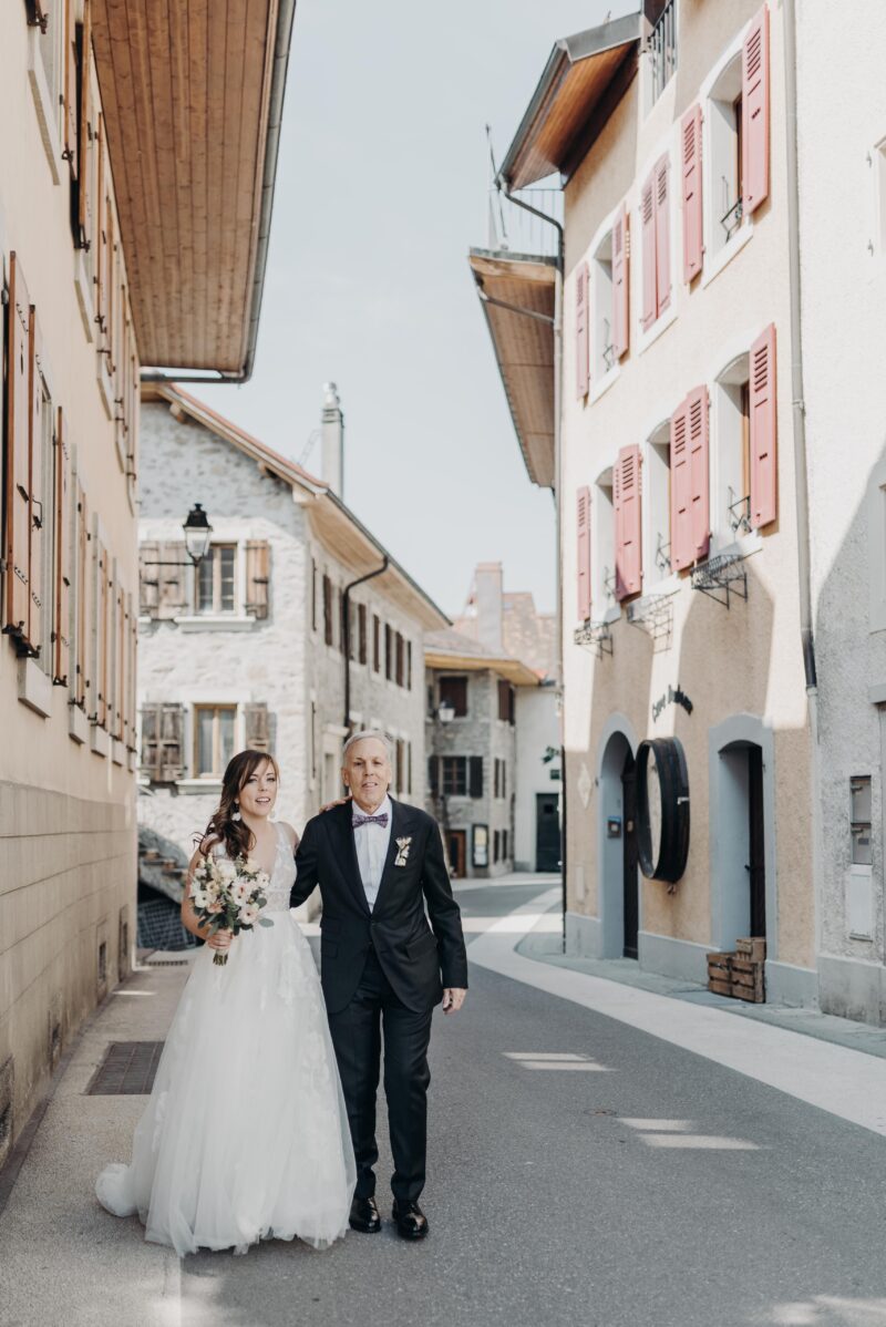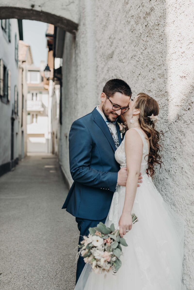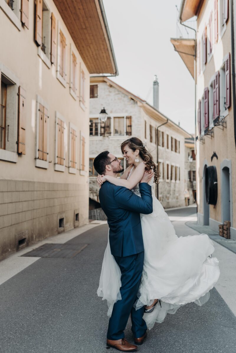 Juste avant de se déplacer pour la soirée, on prend une vingtaine de minutes pour les photos de couple, dans les jolies ruelles de Grandvaux.