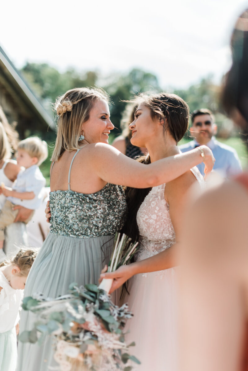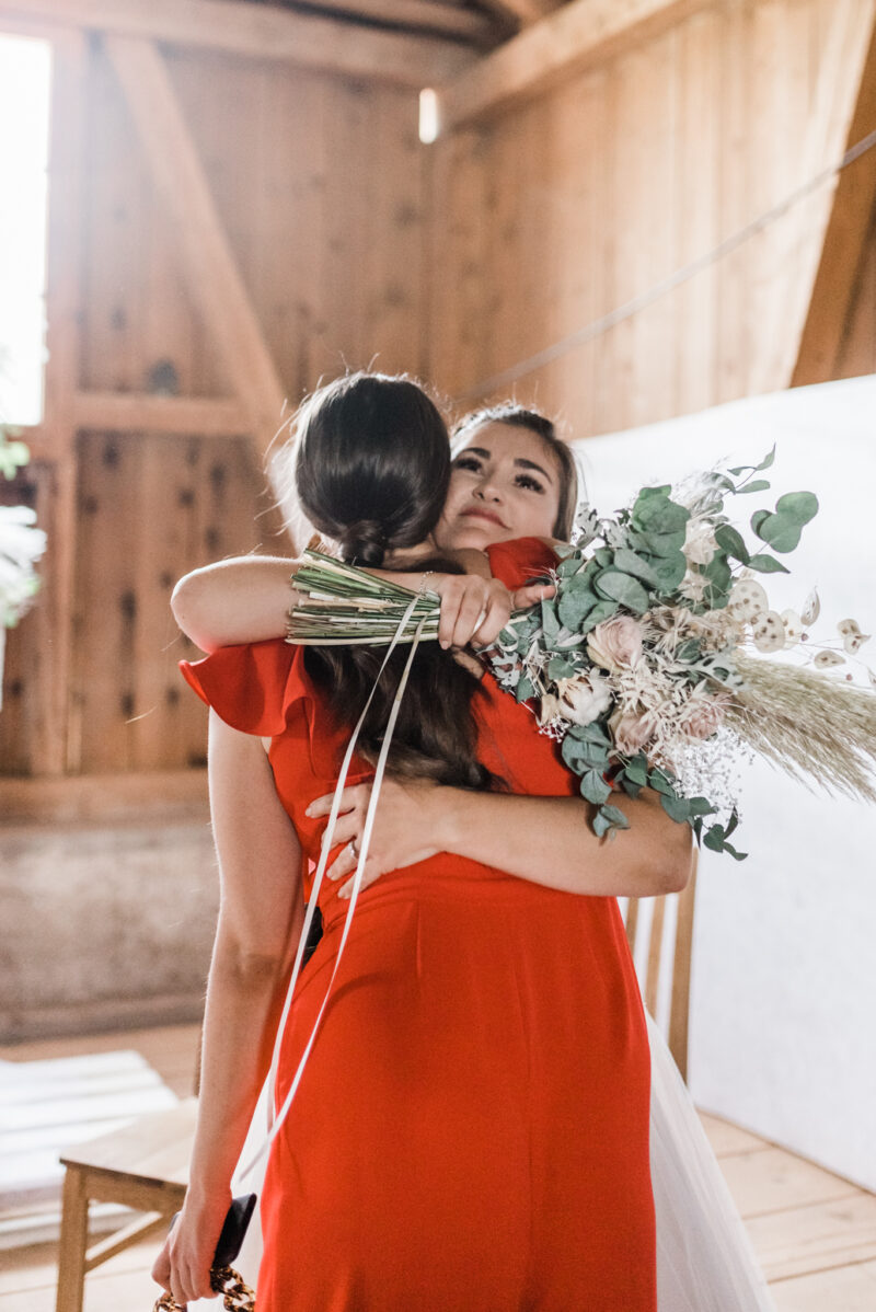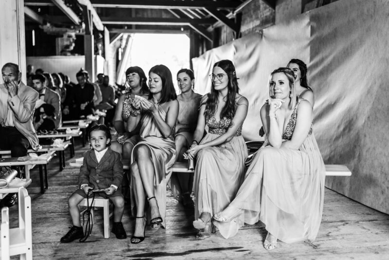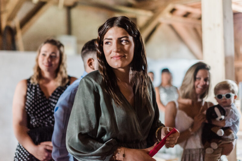 Les invités investissent petit à petit les lieux, à l’abri du soleil dans cette jolie grange. L’attente se termine lorsque Naomi rejoint Marco au bras de son papa.