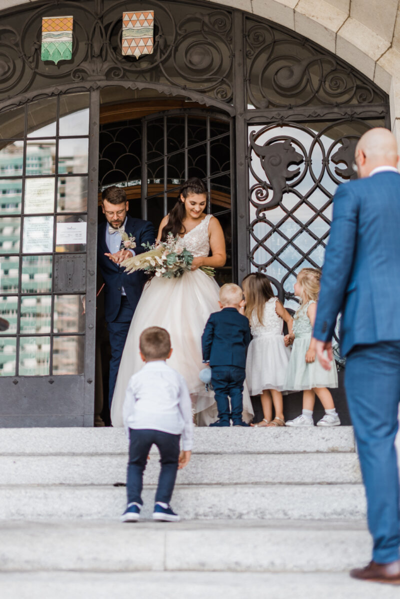 Devant l’état civil du Locle, Marco découvre Naomi pour la première fois en robe de mariée. Les enfants s’amusent, s’inventent des histoires. Ils ont les yeux remplis de curiosité et d’amour, eux aussi.